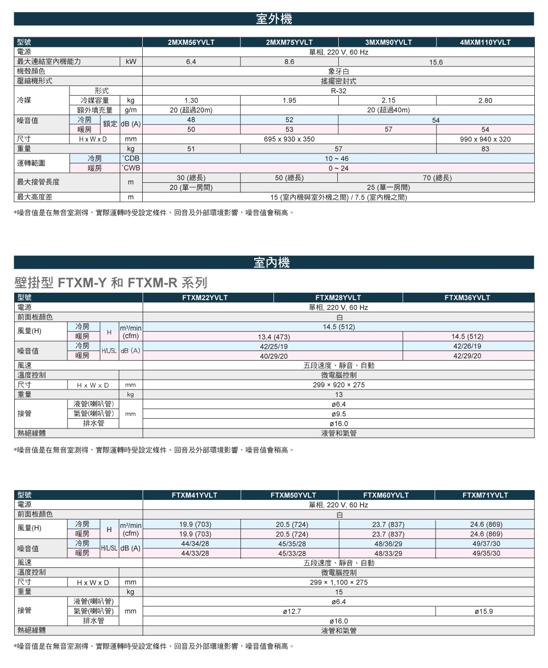 | 型號 | 2MXM56YVLT/FTXM22YVLT+FTXM36YVLT |