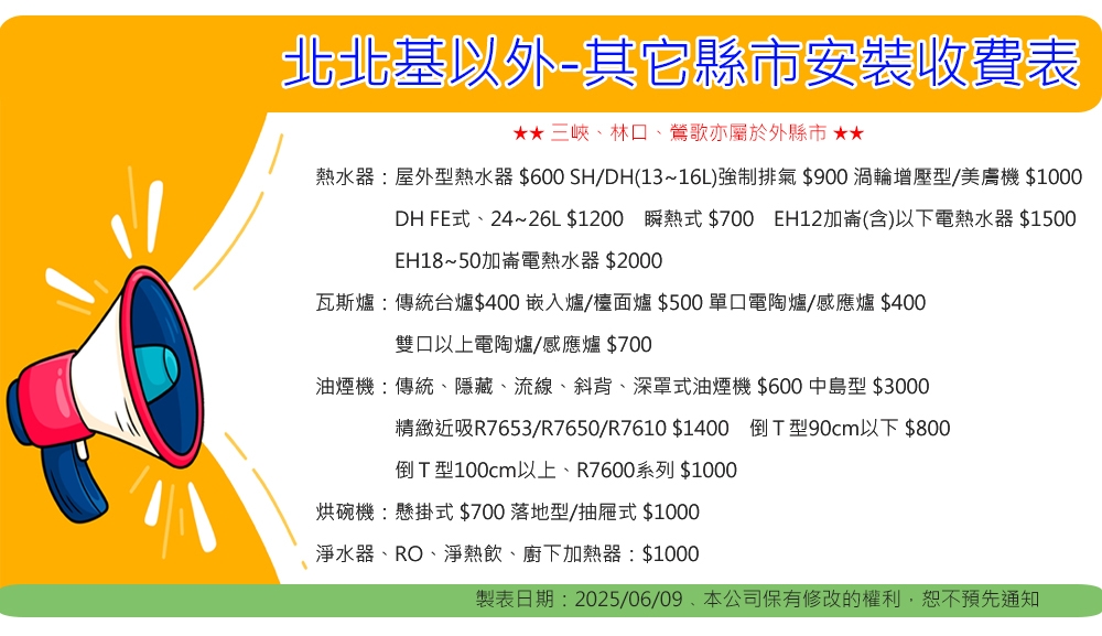 其它縣市地區(含林口三峽鶯歌)如需安裝則會現場收取安裝費,不會退回安裝費,請參考北北基以外縣市收費表。